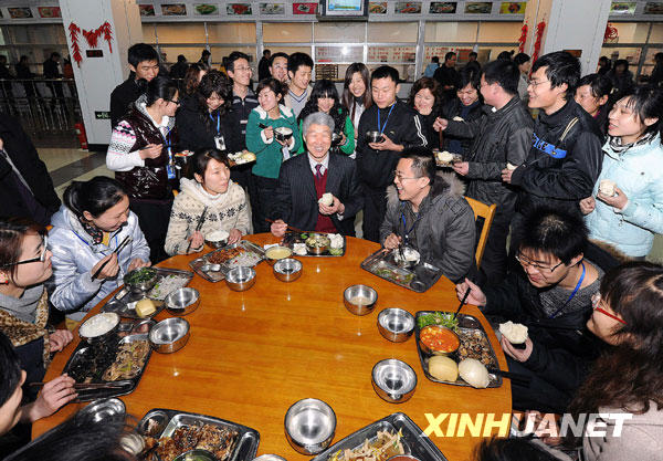 趙志全(中)在職工食堂與新來的大學生們一起用餐,詢問飯菜的質(zhì)量和價格(2月25日攝)