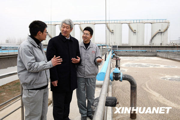趙志全(中)在公司萬噸污水處理池旁向環(huán)保站朱文杰博士(左)了解高效復(fù)合菌種處理合成制藥廢水的研究項目(2月25日攝)。新華社記者何俊昌 攝