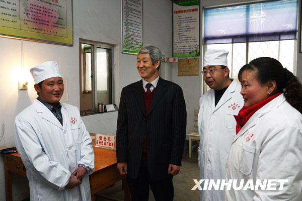 趙志全(左二)針對農(nóng)民看病貴、看病難的問題在費縣城北鄉(xiāng)崮子村衛(wèi)生室了解新農(nóng)合實施后的情況(2月25日攝)。新華社記者 何俊昌攝