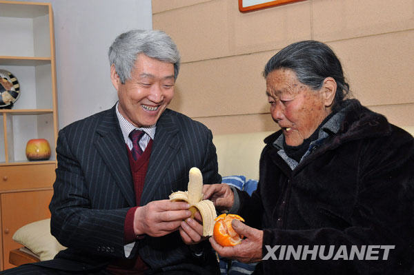 趙志全為“沂蒙六姐妹”之一、86歲的伊淑英老人剝香蕉和橘子(2月25日攝)。新華社記者 何俊昌 攝