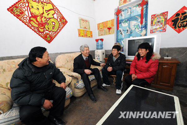 趙志全(左二)在費縣費城鎮(zhèn)中山村徐明珠(右二)家,了解他在大學里的學習和生活情況(2月25日攝)。新華社記者 何俊昌 攝